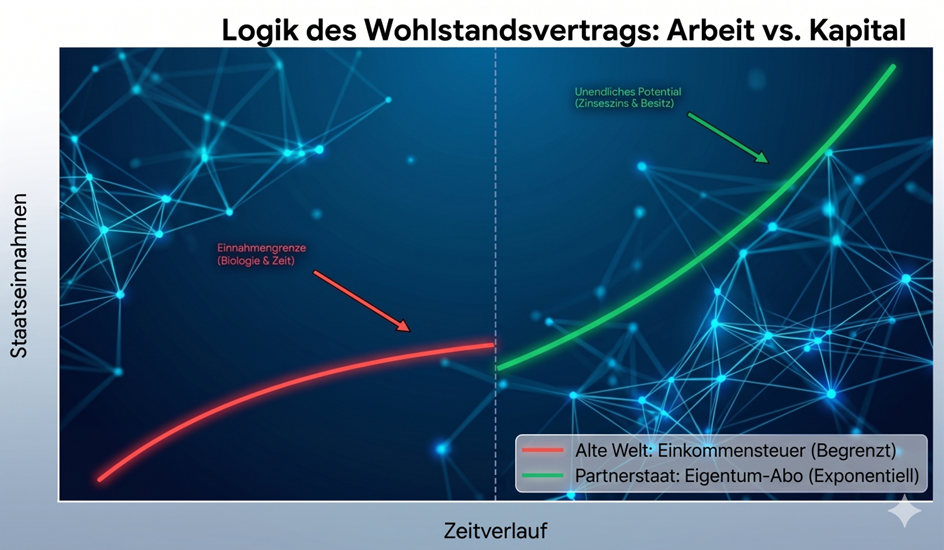 Der Wohlstandsvertrag ist die „iPhone-Logik“ der Staatsfinanzierung: Unter dem Display steckt knallharte Spieltheorie (110 %-Regel) und exponentielle Mathematik (Kapital-Kurve), aber das Interface für den Bürger ist: „Zahl dein Abo, behalt deinen Lohn.“